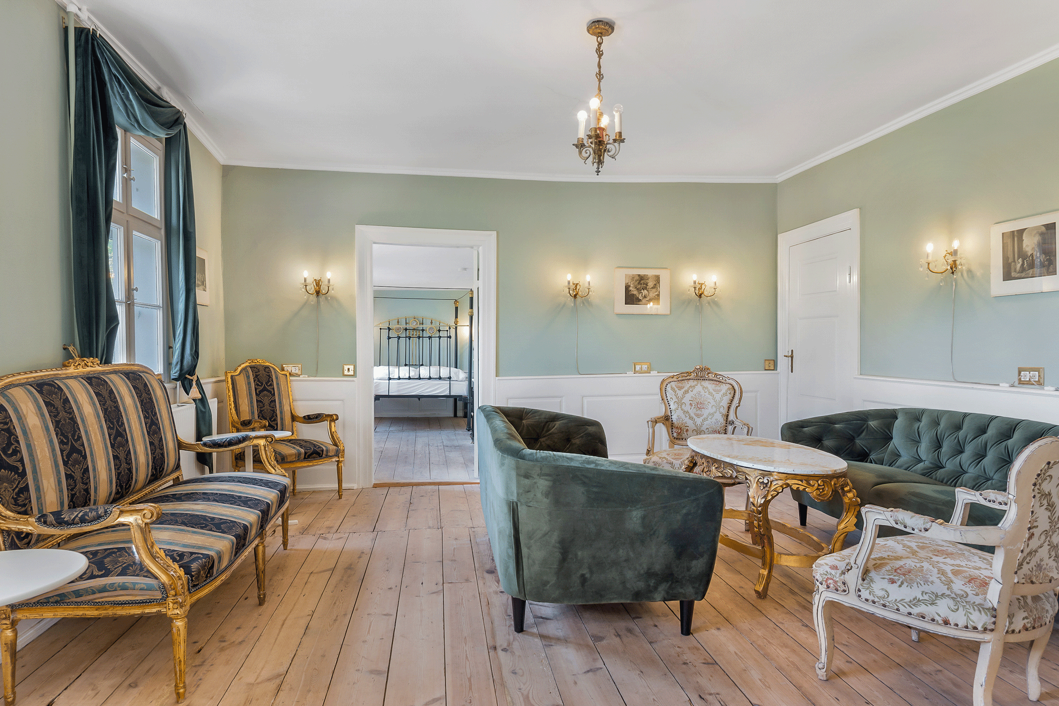 Fordelt på herregårdens stueetage og førstesal finder du 18 eksklusivt og individuelt indrettede værelser, hvoraf 17 har eget badeværelse.